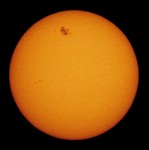 The limb darkening is noticeable on this sun image. When the sun is viewed in the white light, which is approximatively the case here, radiation essentially emerges from a point in the photosphere whose height depends on its agular distance from the sun's center; at disc center, radiation emerges from the photosphere's base (high temperature), and at the limb, it emerges from several hundred kilometres above the photosphere's base, near the temperature minimum. According to the Stefan-Boltzmann and Wien laws, the radiation from the limb must be both less intense and somewhat redder. The slight color change is not detectable on this photograph due to the dominance of the red.