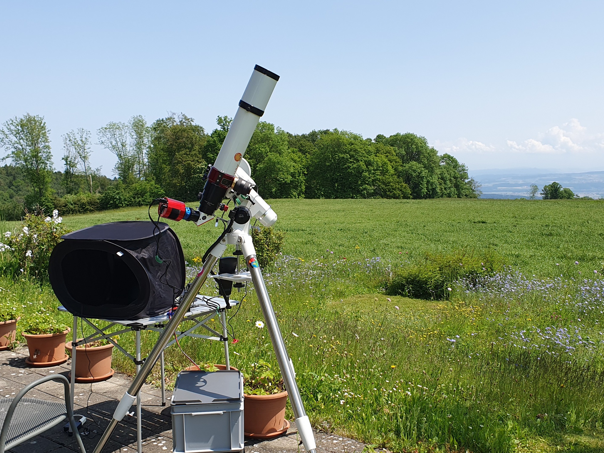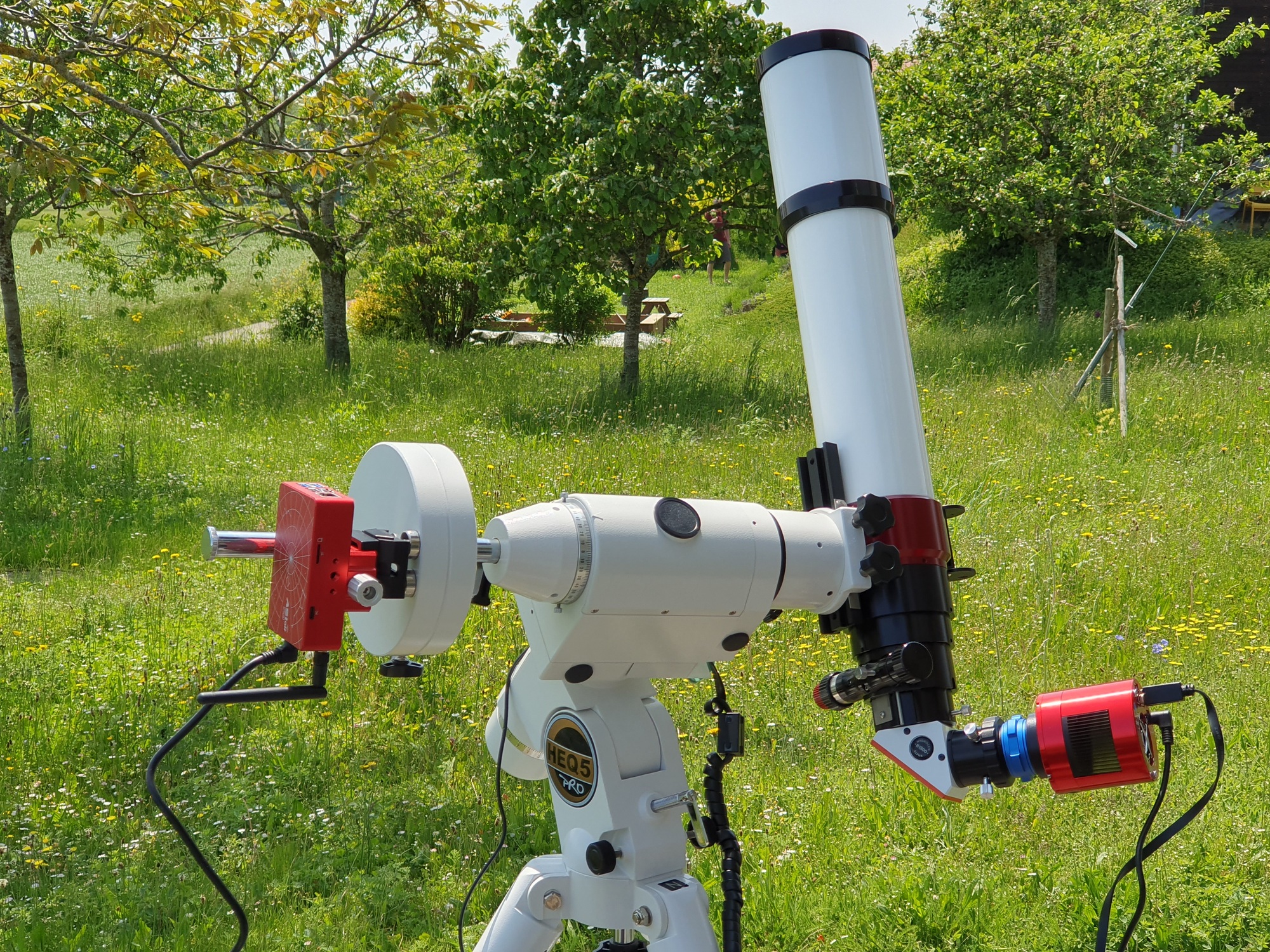 Dedicated solar telescope with 80mm aperture and 560mm focal length. The internal etalon with the pressure tuning system allows for a <0.7Å bandwidth. Solar observation and photography are requiring a safe equipment, as the sun power can induce irreversible eye damages in the case of an unapproriate setup. List of material used on May 28, 2023: Lunt LS80THa/PT/B1800FT + Camera ZWO ASI294MM Pro (uncooled) + Equatorial mount SkyWatcher HEQ5 Pro.