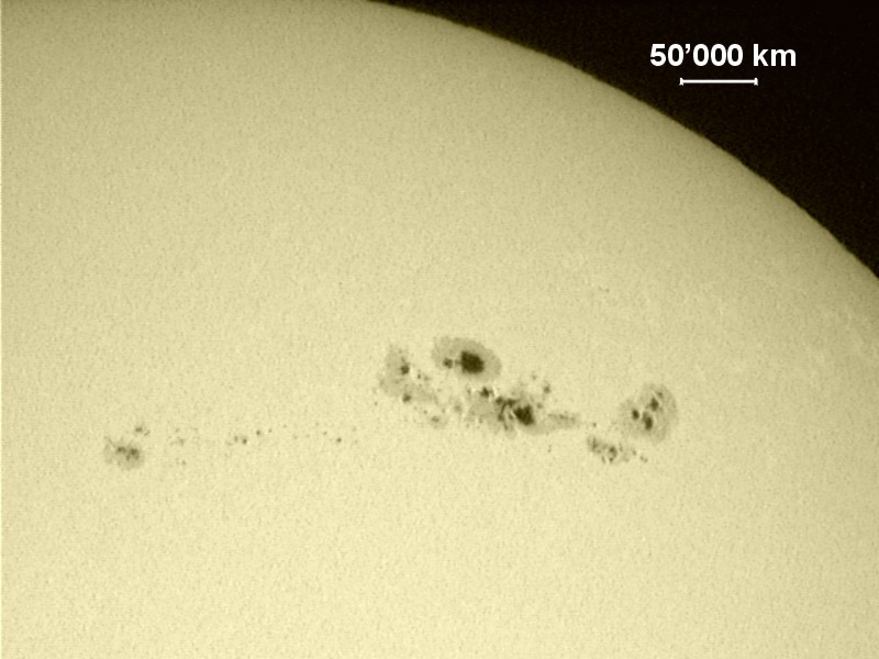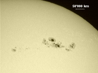The sunspot number or Wolf number, determined by SOHO, was 325 on March 31 2001 at 01H36 UT. This is one of the highest values observed during the cycle 23. The maximum has been reached two days before. Unfortunately, the weather in Switzerland was not optimal at this date. During the sunset and when the atmospheric absorption is high enough, the large sunspot group is visible by naked eye.