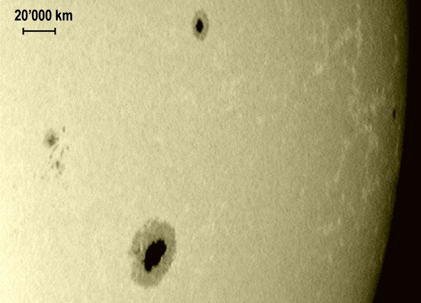 The raw image is taken in VGA format (640 x 480) and on an 8 bits greyscale. The contrast and the intensity have been slightly enhanced. The color has been introduced by modifying the weight of the three RGB channels. The theoretical resolution limit of the instrumentation is 500 km (on the Sun). For the best image obtained this day, a resolution of the order of 1000 km was achieved. Especially for solar photography, the resolution is often limited by the atmospheric turbulence. This is clearly the case here, because the telescope was located on a balcony. In principle, it is not recommended to use instruments with a too large optical diameter, the effects of the turbulence will be enhanced and the image quality reduced. An example of poor resolution during a observation of the Sun is shown on the following movie.