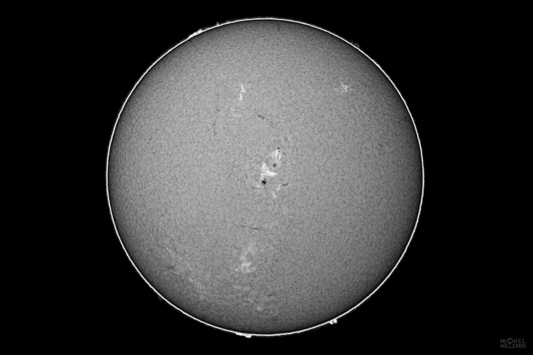 a standard filter of density 5, also called white-light solar filter. The second and third images have been obtained with a Hα filter, selecting only the wavelength emitted by the hydrogen at 656.29nm.