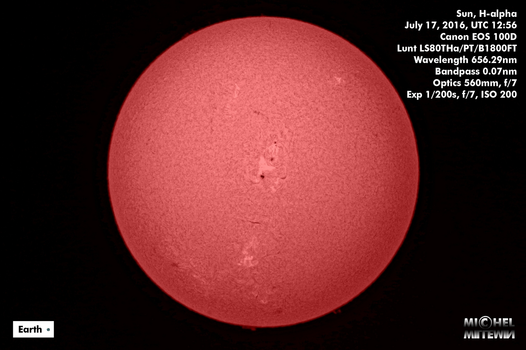 · Sun images taken on July 17, 2016, @ 16:08 UTC (white light, left), @ 13:08 UTC (Hα, center), and @ 12:56 UTC (Hα colored, right)